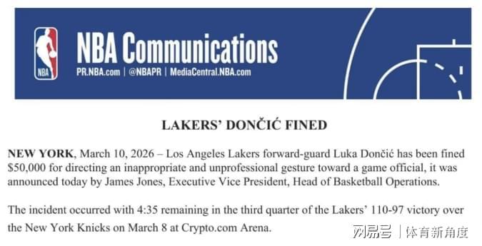 就在今日,NBA联盟以官方之姿,掷地有声地发布了一则引人瞩目的公告,瞬间在篮球界掀起了层层波澜——达拉斯独行侠队的璀璨明星卢卡·东契奇,因在一场硝烟弥漫的对阵纽约尼克斯队的激战中,对当值裁判做出了极具争议且不当的手势,而领到了联盟一张沉甸甸的5万美金罚单。